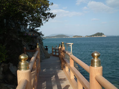 Kannon is a bodhisattva who listens to people’s complaints and helps them mercifully. Here in Aji Town, it’s enshrined in a cave near Takei Sandy Beach, which is the northernmost point of Shikoku. It also had a role as a protective deity for Takamatsu Castle in the Edo era. Sea water sometimes comes up to the approach of the temple. The sand of the beach is coarse weathered granite.